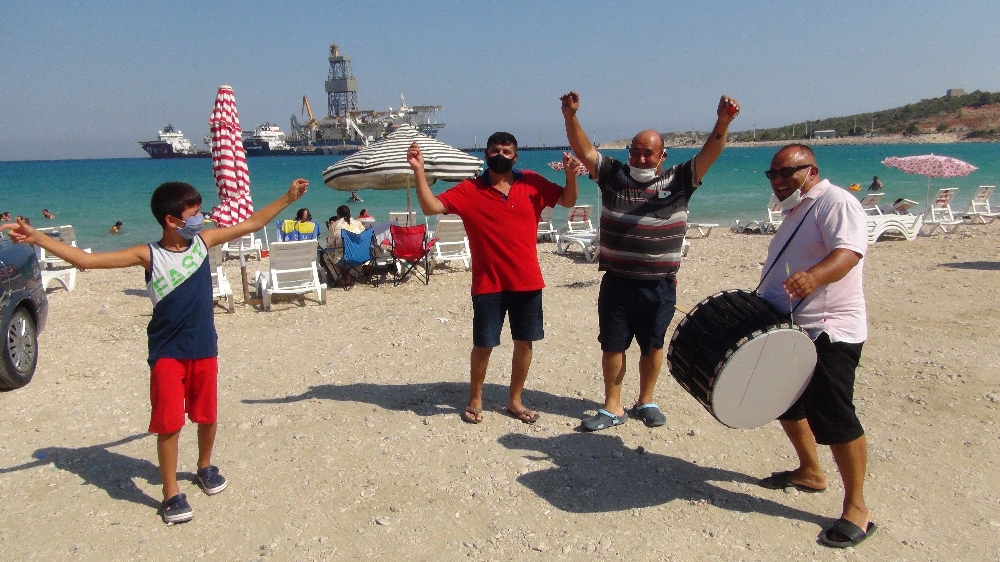Sahilde güneşlenen ve yüzen insanlarla birlikte sevinçlerini paylaşan Silifkeliler, Kanuni Sondaj Gemisindeki çalışanlara seslerini duyurmak ve sevinçlerine ortak olmak için davul çalıp, göbek attılar.