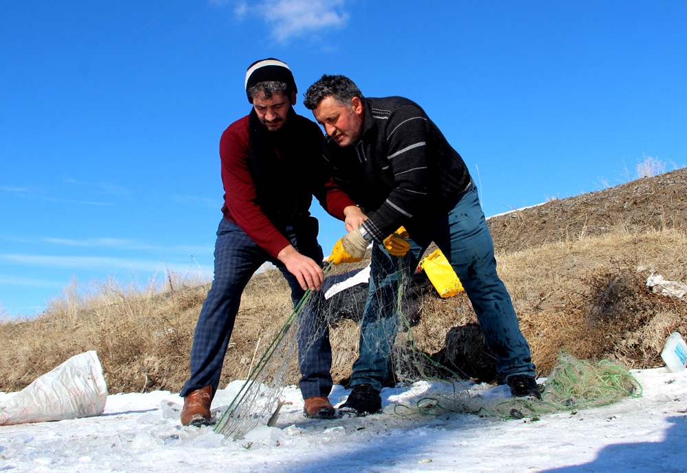 Keyif amaçlı balık tuttuklarını ve köy konaklarında pişirerek yediklerini ifade eden balıkçılar, “Bu meslek babamızdan bize kaldı. Asıl mesleğimiz balıkçılık değil ama özlediğimiz için biz her 10 günde bir avlanmaya geliriz. Keyif amaçlı tutuyoruz aslına bakarsanız. Zor oluyor zahmetli bir iş çünkü 15 santime yakın buzları elimizdeki baltalarla kırıyoruz. Ardından balıkları ses çıkartarak ağlara yaklaştırmaya çalışıyoruz. Biz satmak için yapmıyoruz akşamları köy konaklarında, evlerimizde yiyoruz. Kışın balıklar daha lezzetli oluyor” dedi.