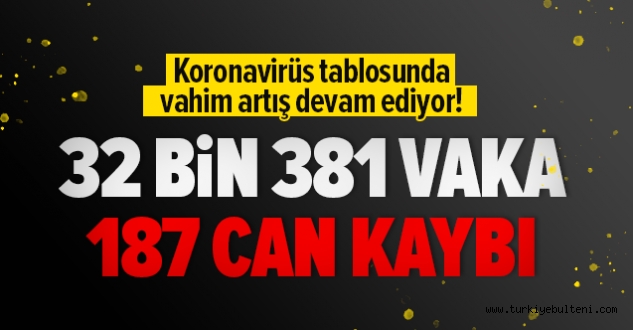 Sağlık Bakanlığının Covid-19 bilgilendirme sayfasında Türkiye’nin güncel korona virüs tablosu kamuoyuyla paylaşıldı. Tabloya göre son 24 saatte 187 kişi korona virüsten hayatını kaybetti, toplam can kaybı 14 bin 316’e yükseldi. Bugün toplam 187 bin 518 test yapılırken, 32 bin 381 yeni vaka sayısı, 6 bin 511 kişi de yeni hasta sayısı oldu. Toplam vaka sayısının 520 bin 167 olduğu, bugün iyileşen 4 bin 190 kişiyle birlikte toplam iyileşen hasta sayısının 418 bin 331’e yükseldiği, toplam hastalarda zatürre oranının yüzde 3,3, toplam ağır hasta sayısının ise 5 bin 611 olduğu açıklandı.