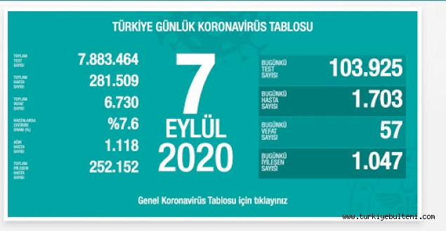 Sağlık Bakanlığının Covid-19 bilgilendirme sayfasında Türkiye’nin güncel korona virüs tablosu kamuoyuyla paylaşıldı. Tabloya göre son 24 saatte 57 kişi korona virüsten hayatını kaybetti, toplam can kaybı 6 bin 730’e yükseldi. Bugün toplam 103 bin 925 test yapılırken, bin 703 yeni vaka tanısı konuldu. Toplam vaka sayısı 281 bin 509 oldu. Bugün iyileşen bin 47 kişiyle birlikte toplam iyileşen toplam hasta sayısı 252 bin 152’e yükseldi. Toplam hastalarda zatürre oranının yüzde 7,6, toplam ağır hasta sayısının ise bin 118 olduğu açıklandı.