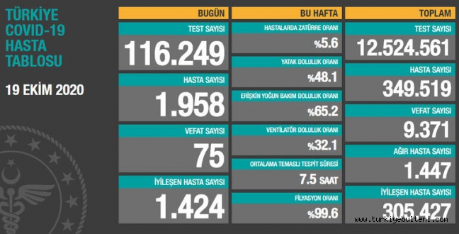 Sağlık Bakanlığının Covid-19 bilgilendirme sayfasında Türkiye’nin güncel korona virüs tablosu kamuoyuyla paylaşıldı. Tabloya göre son 24 saatte 75 kişi korona virüsten hayatını kaybetti, toplam can kaybı 9 bin 371’e yükseldi. Bugün toplam 116 bin 249 test yapılırken, bin 958 yeni vaka tanısı konuldu. Toplam vaka sayısı 349 bin 519 oldu. Bugün iyileşen bin 424 kişiyle birlikte toplam iyileşen toplam hasta sayısı 305 bin 427’e yükseldi. Toplam hastalarda zatürre oranının yüzde 5,6, toplam ağır hasta sayısının ise bin 447 olduğu açıklandı.