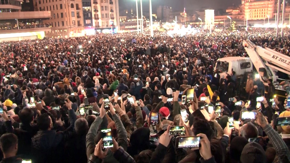 Yılbaşı kutlamaları için Taksim Meydanı ve çevresini dolduran binlerce vatandaş, yeni yıla ‘merhaba’ dedi. Saatlerin 00.00’ı göstermesiyle binlerce kişi yeni yıl coşkusunu birlikte yaşadı. Geri sayımla birlikte havai fişekler patladı. Havai fişek gösterisi altında yeni yıla giren binlerce vatandaş, renkli görüntüler oluşturdu.
