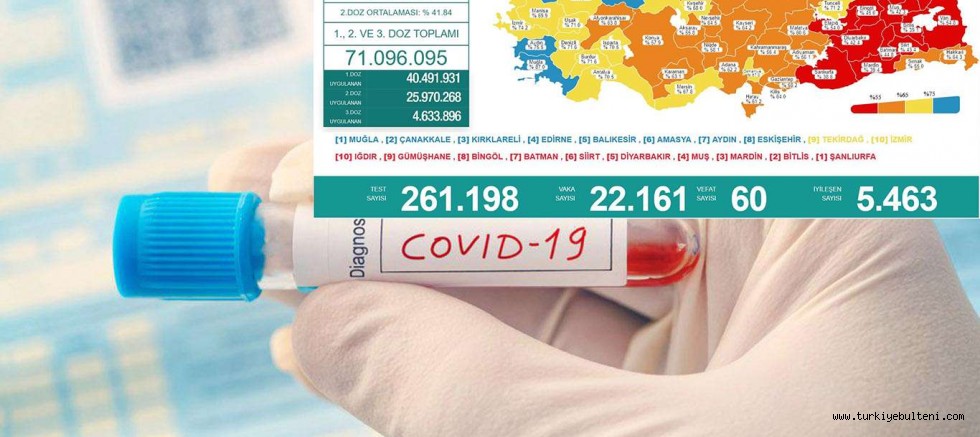 Buna göre; Türkiye'de son 24 saatte 261 bin 198 Kovid-19 testi yapıldı, 22 bin 161 kişinin testi pozitif çıktı, 60 kişi hayatını kaybetti.