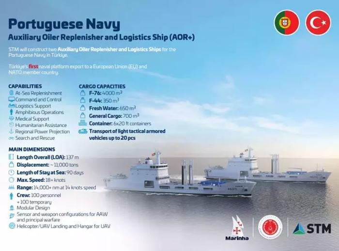 Türkiye, Portekiz Deniz Kuvvetleri için STM Savunma Teknolojileri Mühendislik ve Ticaret AŞ ana yükleniciliğinde tasarlayıp, inşa edeceği iki adet Denizde İkmal ve Lojistik Destek Gemisi ile ilk kez bir Avrupa Birliği (AB) ve NATO üyesi ülkeye askeri gemi ihracatı gerçekleştirmiş oldu.