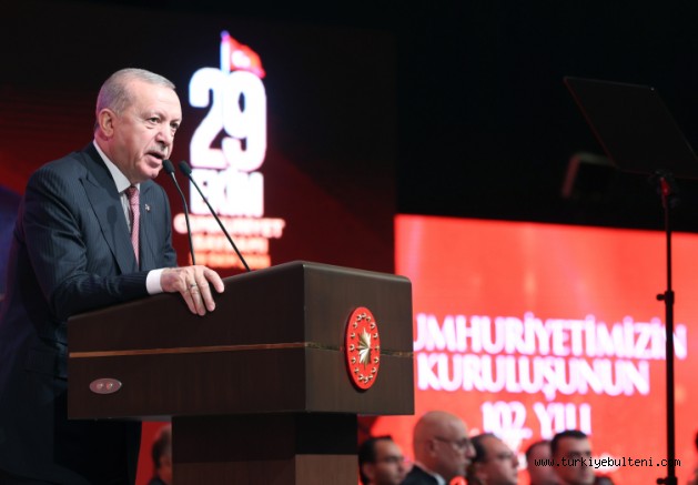 Cumhurbaşkanı Recep Tayyip Erdoğan, Cumhurbaşkanlığı Külliyesi Sergi Salonu'nda düzenlenen 29 Ekim Özel Programı'ndaki konuşmasına, tüm vatandaşların 29 Ekim Cumhuriyet Bayramını tebrik ederek başladı.