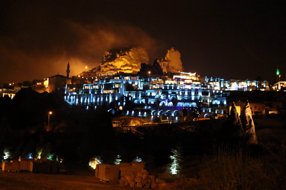 Türkiye’nin önemli turizm merkezlerinden Kapadokya bölgesi yeni yıla karla karışık yağmur yağışı ile giriyor. Nevşehir’in merkez ilçeye bağlı Uçhisar beldesindeki en yüksek peribacası Uçhisar Kalesi ve yamacında bulunan otellerin ışıklandırması kartpostallık görüntü oluşturdu.
