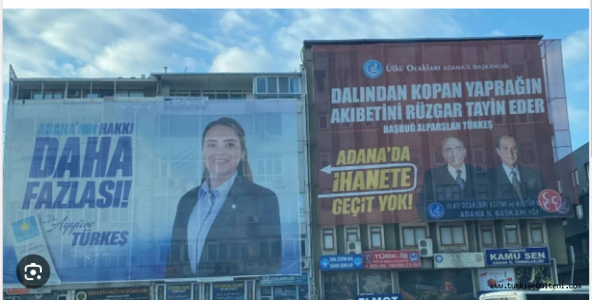 MHP'nin kurucusu ve 'başbuğu' Alparslan Türkeş’in kızı Ayyüce Türkeş, İYİ Parti’nin Adana Büyükşehir Belediye Başkan adayı olmuştu. Adana Ülkü Ocakları, Ayyüce Türkeş’in adaylık pankartının yanına "Adana’da ihanete geçit yok" yazılı pankart astı.