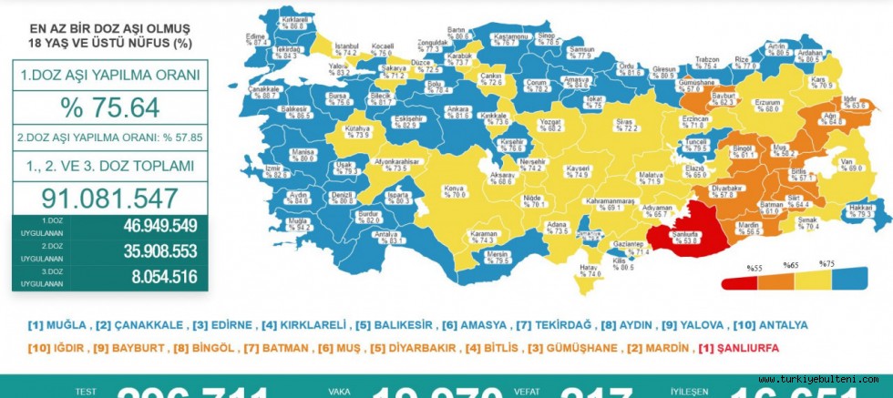 En az bir doz aşı olmuş 18 yaş ve üzeri nüfus verilerinde 1'inci doz Türkiye ortalaması yüzde 75,64, 2'nci doz ortalaması yüzde 57,85 olarak ölçüldü. Ayrıca, 1'inci dozda 46 milyon 949 bin 549, 2'nci dozda 35 milyon 908 bin 553 ve 3'üncü dozda 8 milyon 54 bin 516 olmak üzere toplam 91 milyon 81 bin 547 aşı uygulandı.