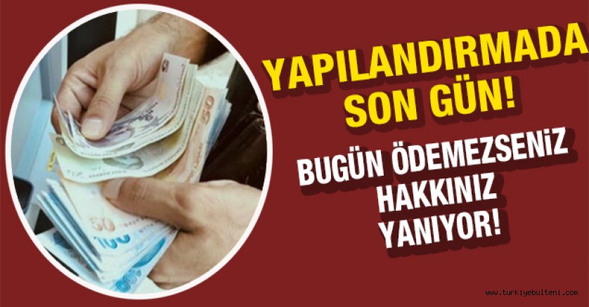 7326 sayılı yasa çerçevesinde borcunu yapılandıranların peşin ödeme ya da ilk taksit için ödeme süresi için bugün son gün. Ayrıca ikinci taksit için de son ödeme günü 30 Kasım. Bu her iki taksit zamanında ödenmezse Yapılandırma bozulacak.