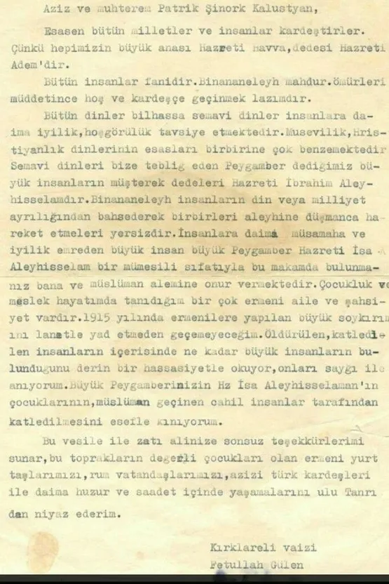 FETÖ elebaşı terörist Fettullah Gülen'in 1965 yılında Kırklareli vaizi iken Ermeni Patriğine mektup yazarak 1915 Techir Olayına yer vererek bunun soykırım olarak niteleyip lanetle yad ettigi bu olayın müslüman olarak geçinen cahil insanlar tarafından yapıldığını belirterek mektup yazdığı orta çıkmıştı.