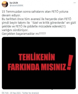 Daha önce de pek çok kez FETÖ’ye ilişkin uyarılarıyla dikkat çeken Yargıtay 5. Ceza Dairesi üyesi İsa Çelik, dün sosyal medya hesabından yaptığı paylaşımda, “15 Temmuz’dan sonra safralarını atan FETÖ, yoluna devam ediyor. Bu tarihten önce tüm avanesi ile her yerde olan FETÖ, şimdi beyin takımı ile ‘özel ve kritik görevlerde’ en gizli şekilde ve FETÖ ile şiddetle mücadele ederek (!!!) varlığını sürdürüyor. Gerçekten başaramadılar mı?” ifadelerini kullandı. Çelik, paylaşımında, “Tehlikenin farkında mısınız?” yazılı bir görsel de kullandı.