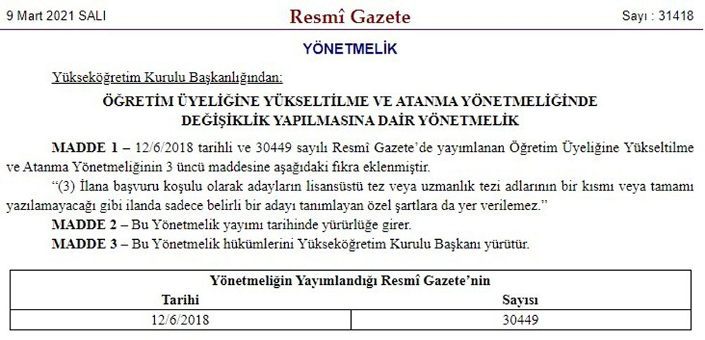“Bu kapsamda yükseköğretim kurumlarımızın akademik kadro istihdamında ‘liyakat ve fırsat eşitliğini’ artırmak amacıyla ‘Öğretim Üyeliğine Yükseltilme ve Atanma Yönetmeliği’nde yaptığımız düzenleme bugün Resmi Gazete’de yayımlanarak yürürlüğe girdi. Yaptığımız bu çalışma neticesinde; Profesör, Doçent ve Doktor Öğretim Üyesi kadrolarının özel şartlarında adaylara ait tez/uzmanlık tezi adlarının bir kısmı veya tamamı yazılamayacak. Ayrıca, ilanın özel koşulunda belirli bir adayı tanımlayan özel şartlara da yer verilemeyecek. Belirli bir adayı tanımlayan özel şartların öğretim üyesi alımlarındaki atama ilanlarında yazılmasını engellemeyi hedefleyen ve ‘fırsat eşitliğini, rekabet ve kaliteyi önceleyen’ bu düzenlememizin yükseköğretimimiz ve akademisyen adaylarımız açısından hayırlı olmasını dilerim.”